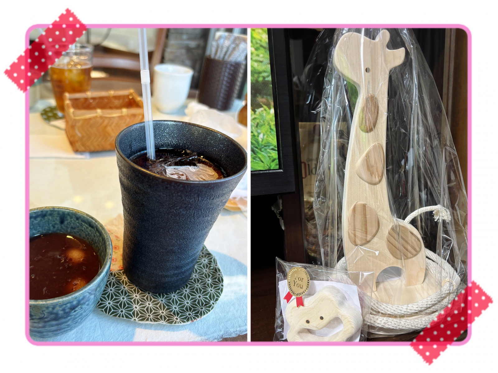 プレゼント こちらのカフェで売ってる手作り木工作品が好きで❤️キリン好きな私は自分にこれを買いたかったけど、汚部屋すぎて飾るとこもないので かなり遅れた出産祝いに🥳歯固めと一緒にしたら可愛いかな❤️白玉ぜんざい食べながら 店員さんも一緒にあれがいい?キリンがいい?と悩んでくれて有り難かったな。
