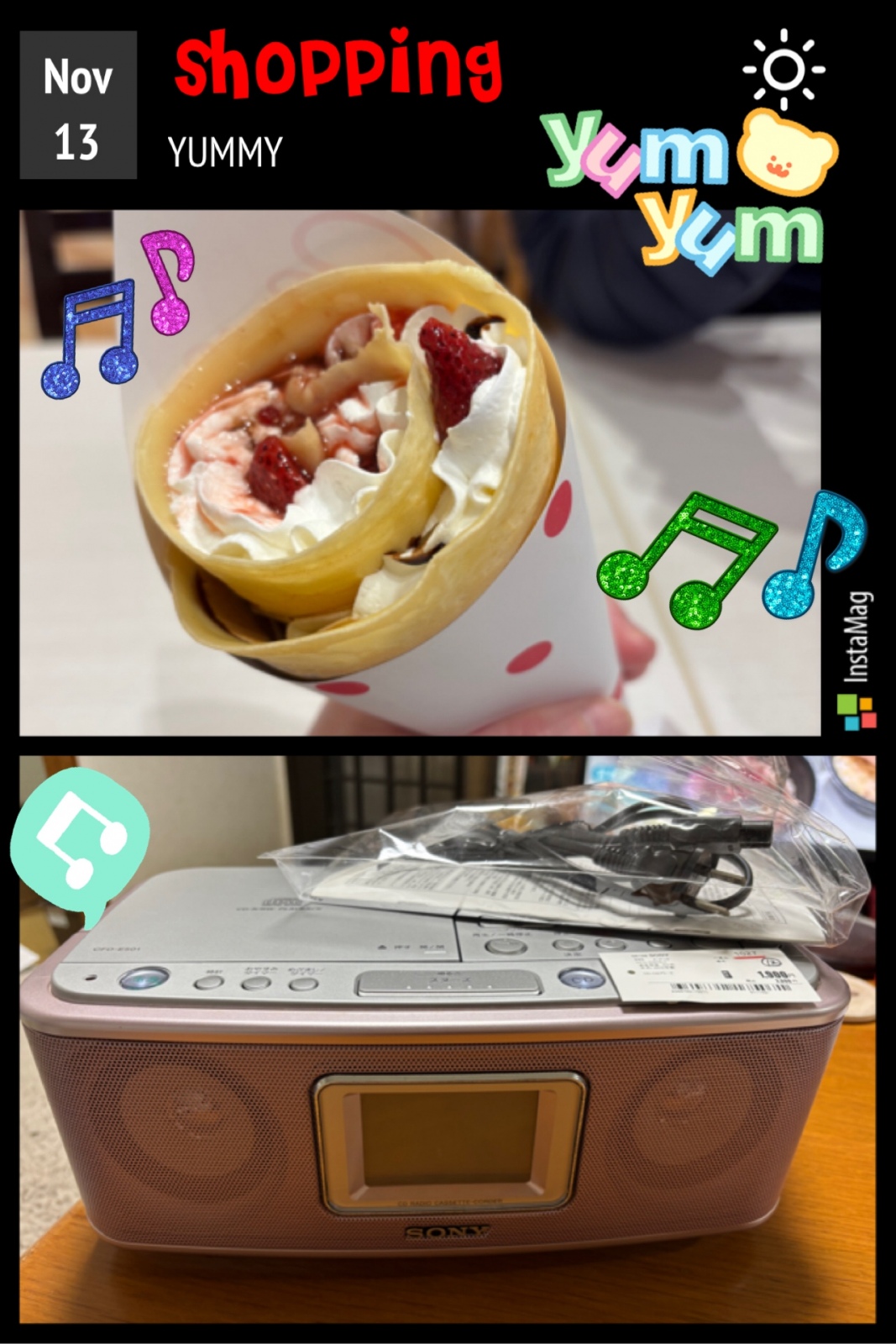 プラプラお買い物 初めてのショッピングモールのセカストにプラっと入って 思わずCDラジカセを1900円で見つけて買ってしまった。母がCD聴きたがってたし、あげてもいいなぁと。SONYだし、一応ちゃんと聴けたし大丈夫かな。クレープはホイップ(少し苦手)チョコカスタードいちご🍓とってもおいしかった!まぁ、痩せないわな。。。