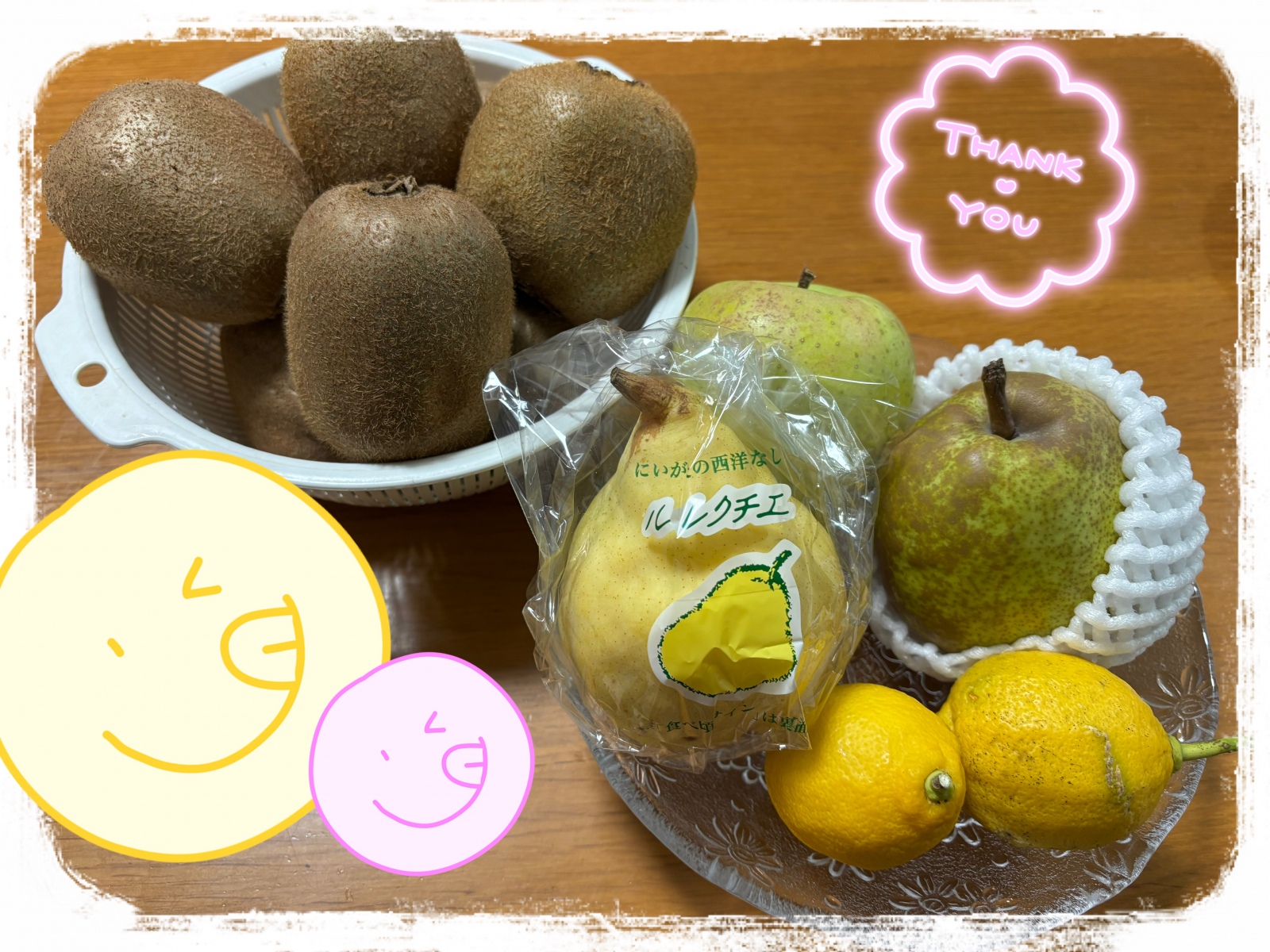 フルーツたくさん お散歩や車出しするとMちゃんママから何かしら頂く。最近はフルーツが多いかな。立派すぎるキウイ🥝高級品のルレクチェ。お庭の木になってるレモン🍋等々有り難く毎朝いただいてます❤️キウイはアレルギーあるからほんの一切れしか食べられないけど、Fっちが喜んでる☺️
