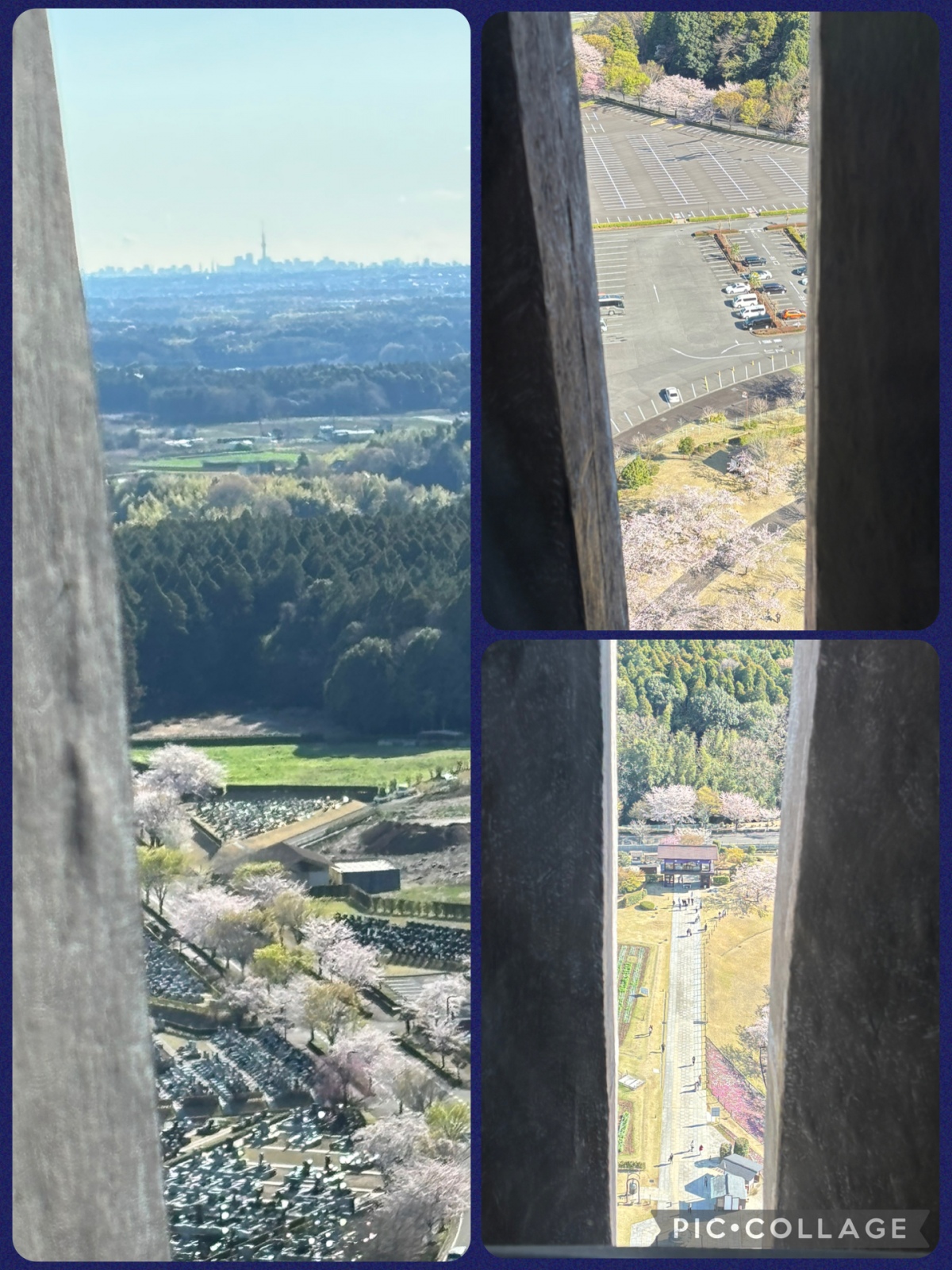 胎内めぐり 地上85mからの眺め。ちょっと不鮮明かな?大仏さまの胸や肩、背中など細長い窓があり見下ろせるけど、一面の窓じゃないから桜並木を見渡せず残念。遠くスカイツリーは見えたけど富士山は見えなかった🥲