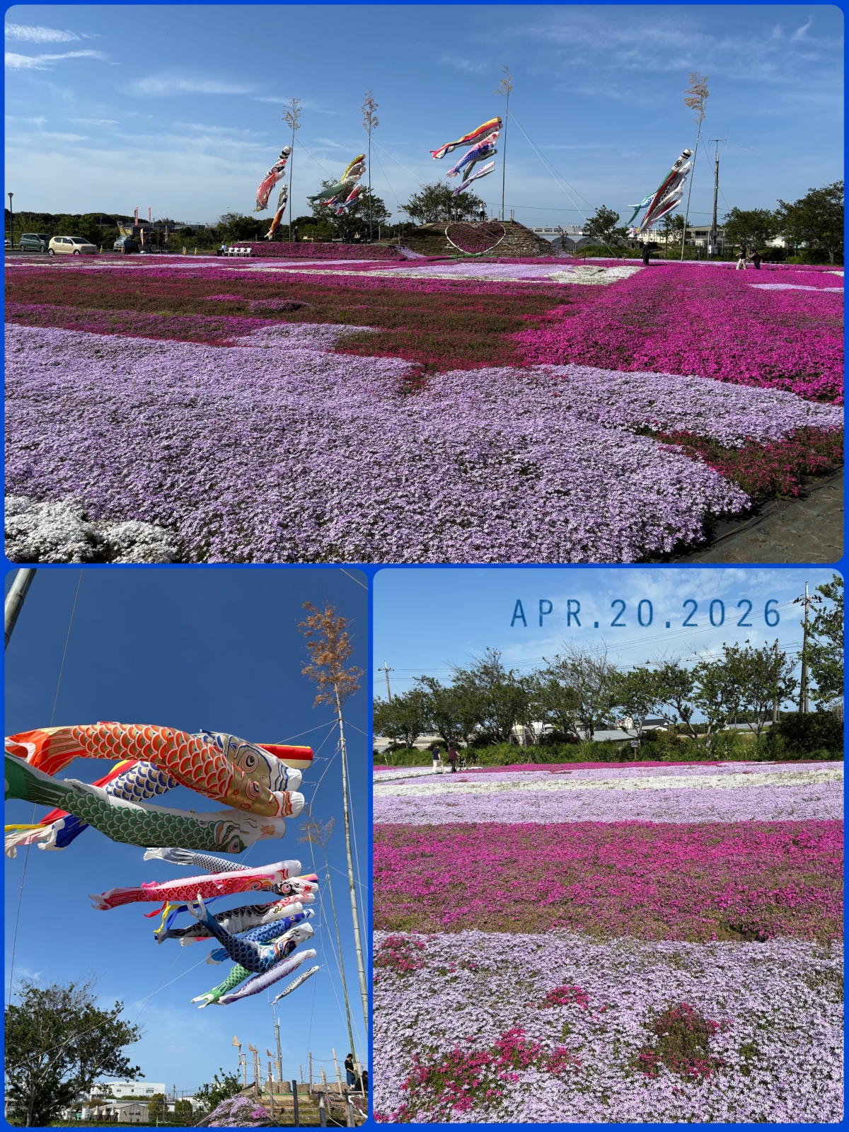 芝桜 先日 義母と会った後、近くで芝桜が見頃と聞いたので ちょこっと見に行ってきた♪規模は小さかったけど、青空に鯉のぼりも泳いでて とってもキレイだった。まだ満開ではなかったから、来週あたり?もっと美しいんだろうなぁ。義母にも見せてあげたかったな。